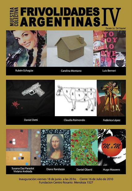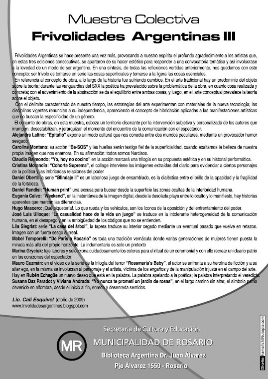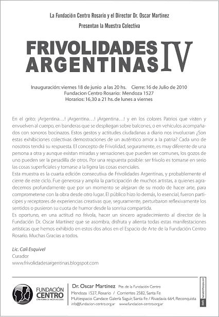 - La primera versión de Frivolidades Argentinas tiene su inicio en el 2007, el entusiasmo de los artistas y el éxito de publico estimuló la realización año a año de una muestra hasta llegar a una cuarta edición, las tres primeras fueron exhibidas en la Biblioteca Argentina, y la última en la Fundación Centro Rosario donde el curador es Coordinador de Arte. Las imágenes de las obras darán testimonio de la importancia de las propuestas de los artistas, de diferentes miradas estéticas, provocando en el espectador entusiasta participación y el asombro por lo variado y creativo de las obras. Cali Esquivel Ver: www.caliesquivel.blogspot.com /// www.curaduriacaliesquivel.blogspot.com ///www.curaduriacaliesquivel2010.blogspot.com
